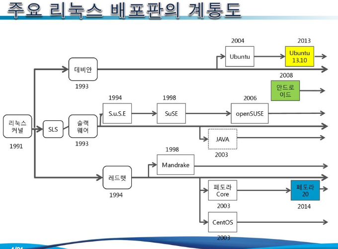 - 리눅스 배포판은 크게 레드햇(Red Hat), 데비안(Debian), 슬랙웨어 계열로 구분할 수 있다.