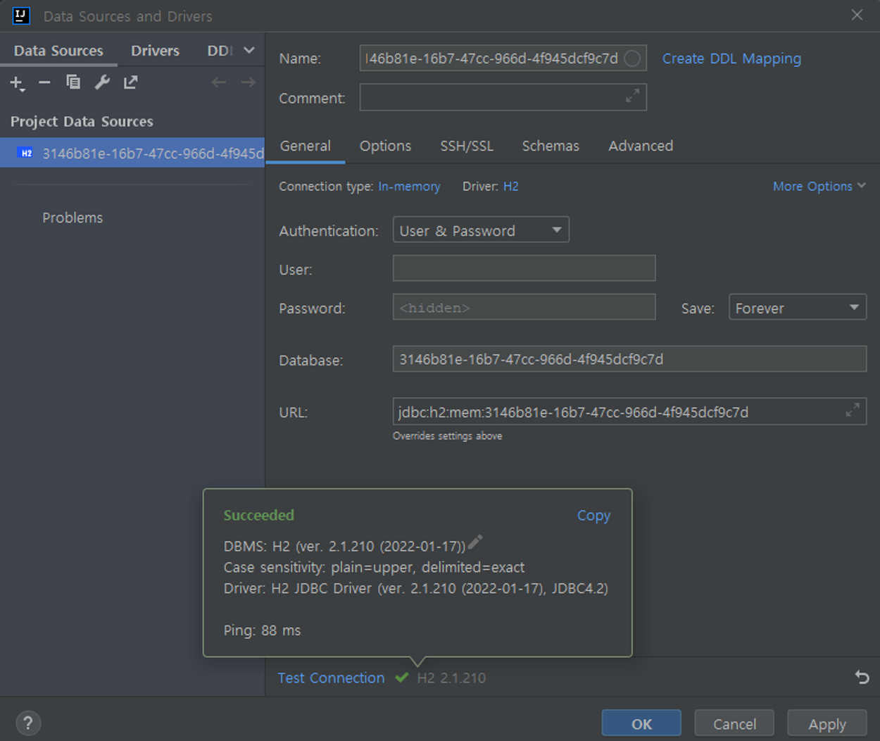 - URL 부분에 jdbc:h2:mem:3146b81e-16b7-47cc-966d-4f945dcf9c7d 입력 후 테스트하여 OK