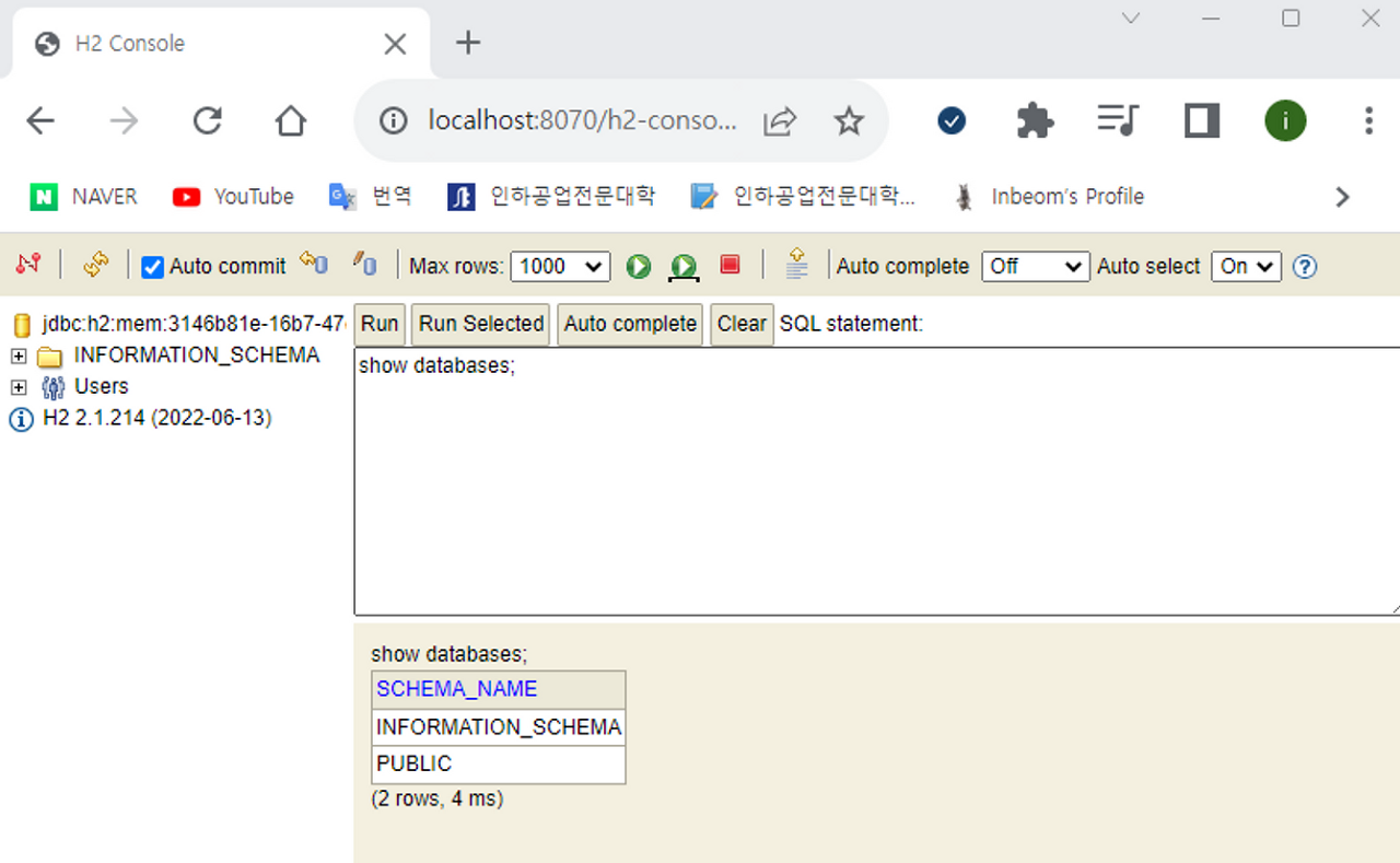 - 서버 실행 후 http://localhost:8070/h2-console주소로 접속한다.