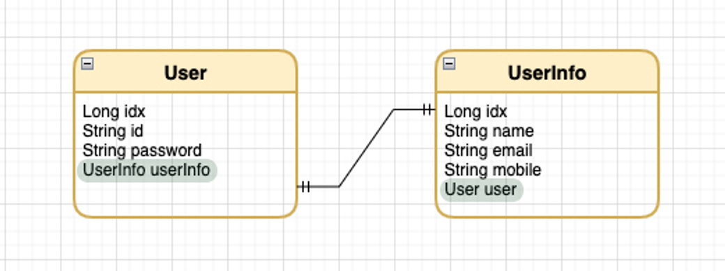 양방향 매핑의 경우 대상 테이블 (UserInfo)의 외래키에 @OneToOne( mappedBy=userInfo )속성을 통해 주테이블의 외래키를 연관 관계의 주인으로 설정한다.
