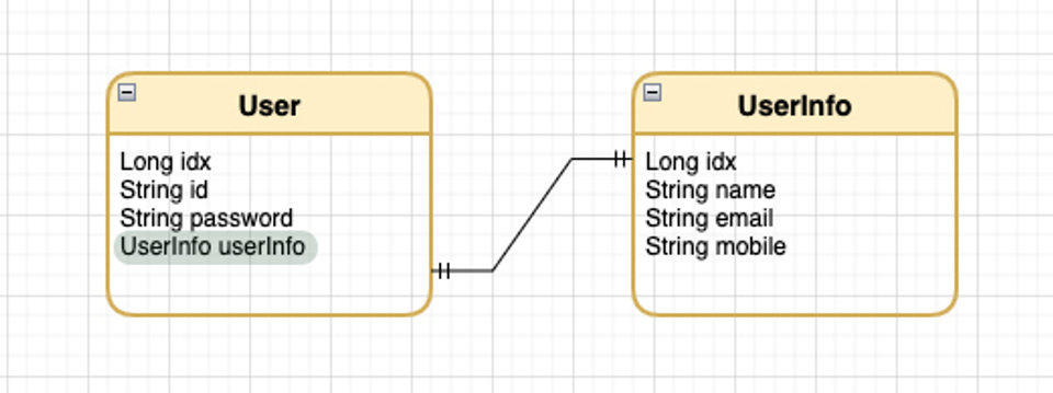 대상 테이블의 외래키에 **@JoinColumn(name = "user_idx", referencedColumnName = "idx")**으로 주 테이블의 참조할 키를 지정하고, 주 테이블에서 @OneToOne(mappedBy = "user") mappedBy = “”속성으로 연관 관계의 주인을 대상 테이블의 외래키로 지정하면 된다.
