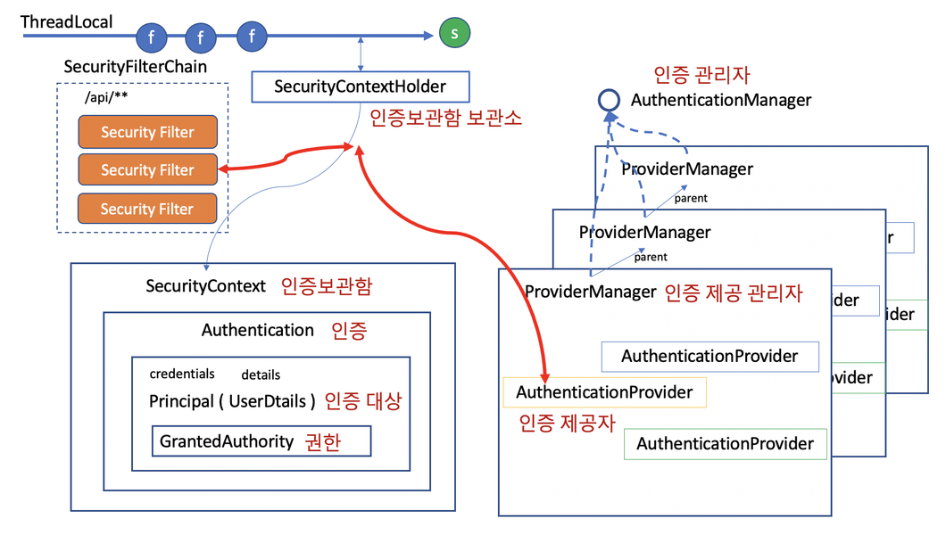 - 이들 필터가 하는 일은 AuthenticationManager 를 통해 Authentication 을 인증하고 그 결과를 SecurityContextHolder 에 넣어주는 일입니다.