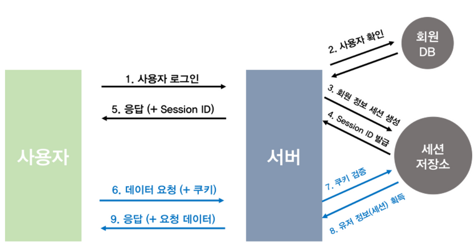 - 서버에서는 쿠키를 받아 세션 저장소에서 대조를 한 후