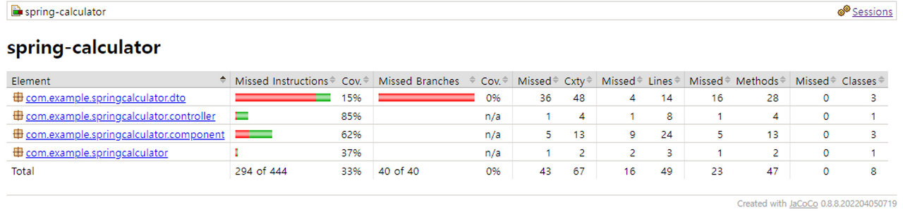 - 좌측의 프로젝트 메뉴에서 build → reports → jacoco → test → html → index.html 파일 웹으로 실행하여 결과값 보기