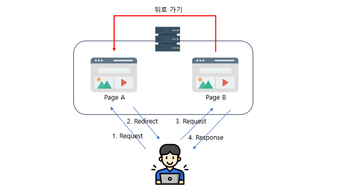 웹브라우저에서 페이지를 이동하면 자체적으로 방문기록(History)을 캐시(cache)에 저장하는데 뒤로가기 버튼을 누르면 캐시에 저장되어있는 가장 최근 페이지로 이동한다.
