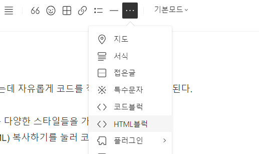 5. 블로그 글 작성화면에서 HTML블럭을 선택하여 붙여넣기하면 완성