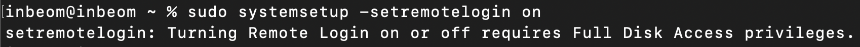 ssh를 활성화 하려면 'systemsetup -setremotelogin on' 명령으로 remotelogin을 on해주면 되는데 보통 아래와 같이 디스크 접근 권한이 없을 것이기 때문에 먼저 terminal에 디스크 접근 권한을 줘야한다.