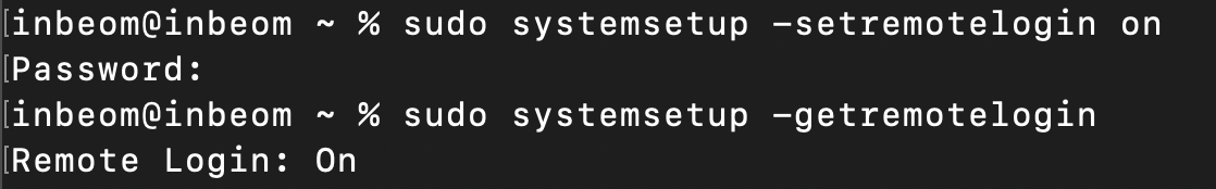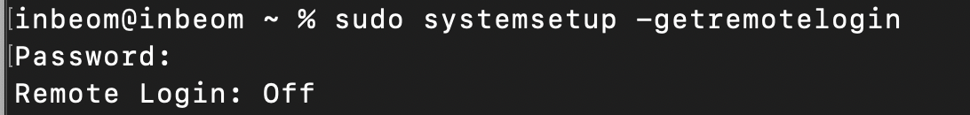 'sudo systemsetup -getremotelogin' 명령을 사용하면 현재 remotelogin의 활성화 상태를 확인할 수 있는데 Off로 설정되어 있다면 비활성화 되어있는 것이다.