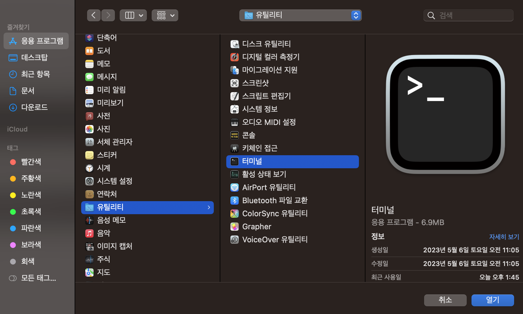 + 버튼을 누르고 Finder가 뜨면 응용프로그램 > 유틸리티 > 터미널을 클릭하고 열기 버튼을 눌러서 접근 권한 목록에 추가해준다.
