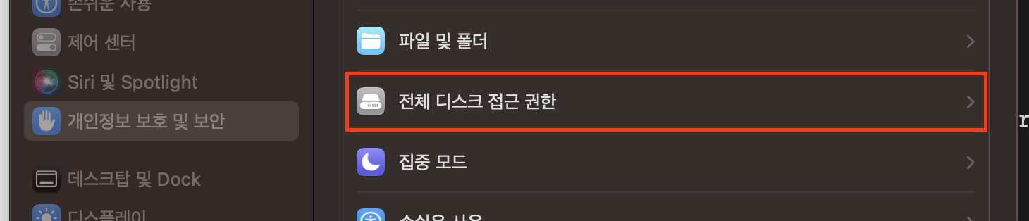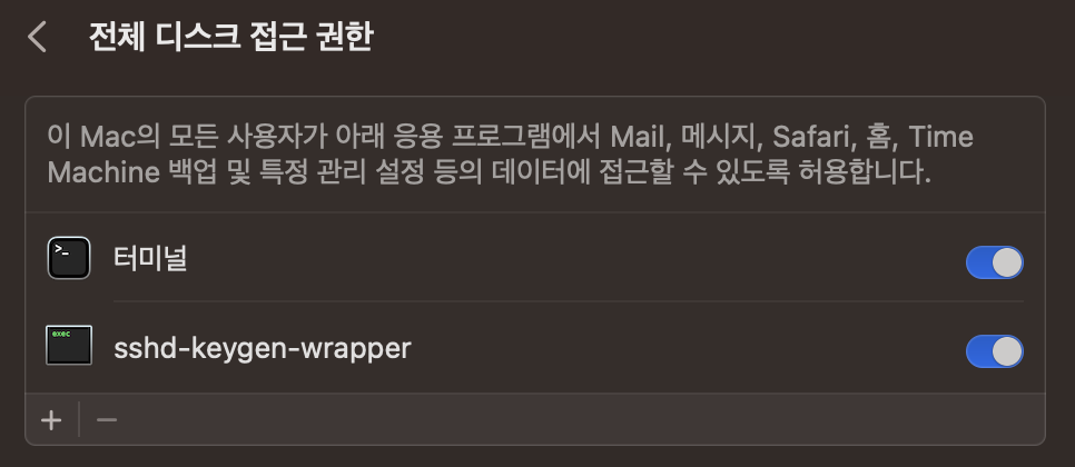 시스템 설정 > 개인정보 보호 및 보안 > 전체 디스크 접근 권한 메뉴로 들어가면 + 버튼을 눌러 접근 권한을 줄 프로그램을 선택할 수 있다.