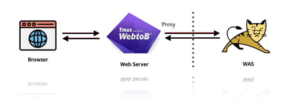 WAS는 일반적으로 HTTP Listener를 가지고 있는데, WebtoB는 reverse proxy 설정을 통해 WAS의 HTTP Listener와 연결 을 맺어 연동하게 된다.