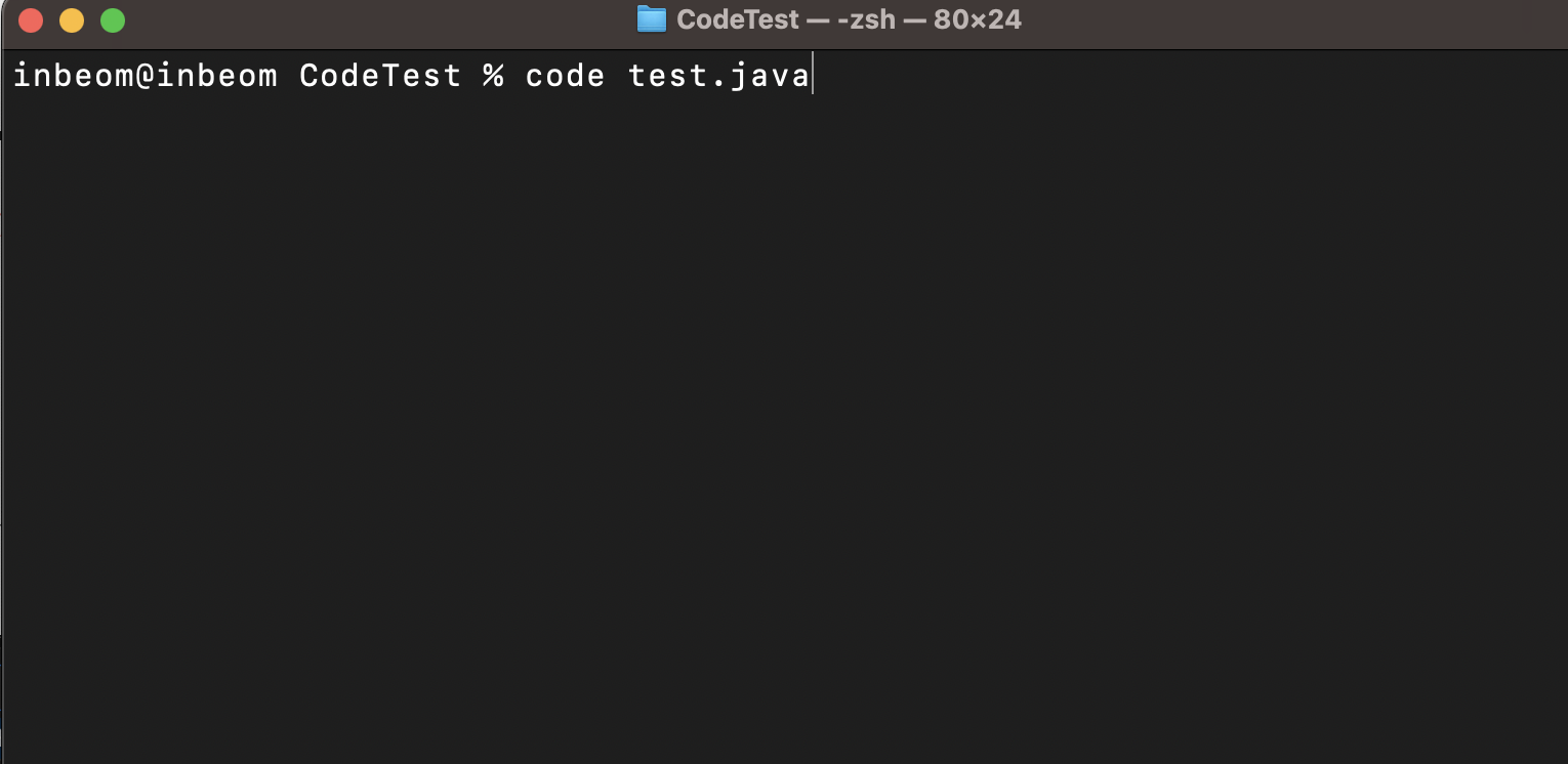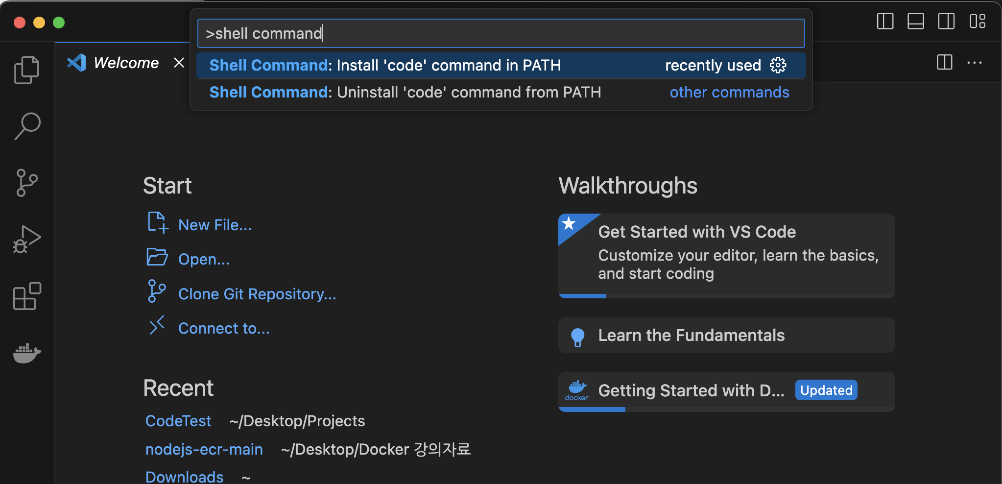 VSCode를 실행하여 위의 검색창에 >shell command 라고 입력한 후 첫 번째로 나오는 install을 선택하면 바로 code 명령어를 사용하여 VSCode를 열 수 있다.