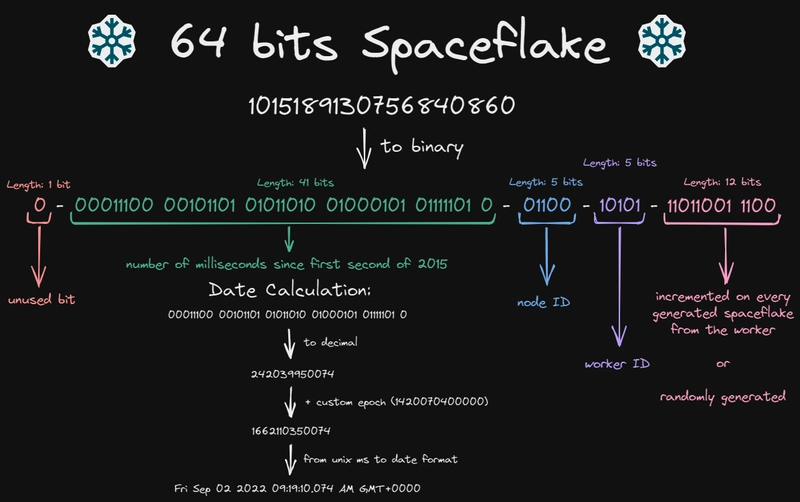 Snowflake 알고리즘은 64비트 정수를 만들어내는 방식으로, 이 정수는 크게 4부분으로 구성된다.