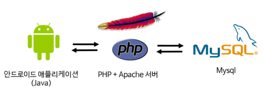 - 안드로이드 애플리케이션은 보안상의 이유로 ‘외부’ 데이터베이스에 바로 접근하지 못하기 때문에 (php+서버)를 중간에 두고 연결하여 사용해야 한다.